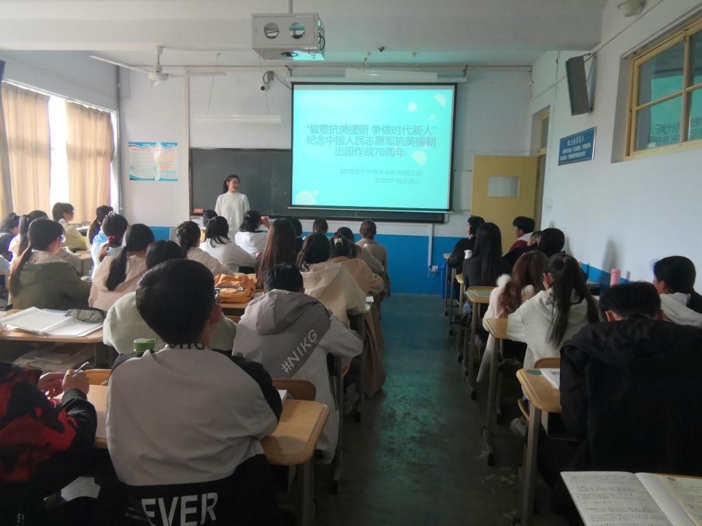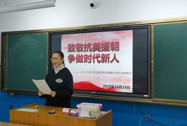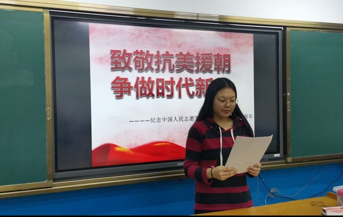 活动开始,各团支部全体同学起立向在抗美援朝中逝去的英雄们默哀,致以当代青年学生对英雄最崇高的敬意。随后,全体同学们认真观看致敬抗美援朝纪录片,在纪录片播放结束后,请同学们就影片内容开展座谈会并交流学习感悟。最后,让同学们对抗美援朝中体现的英雄精神及我们这一代青年人应当怎样更好地将英雄精神传承下去等问题进行探讨,并由团员代表分享其看法观点。