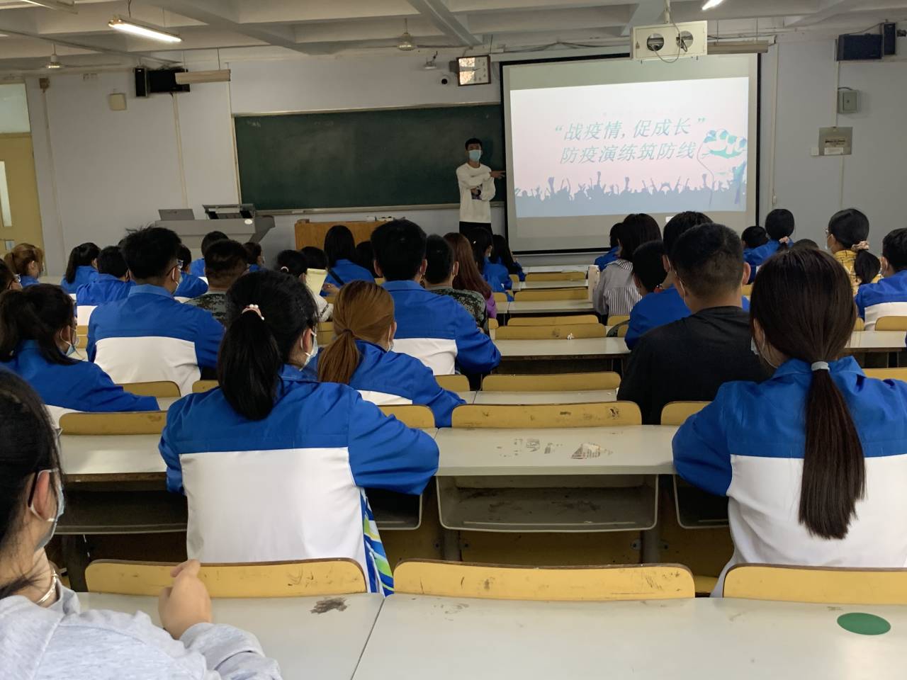 活动伊始,由各班负责人下发活动通知,通知学生务必戴好口罩。随后学生自觉排队进入教室,活动负责人依次对学生进行体温测量和消毒。接下来对学生们进行防疫知识讲解,有关于教室、食堂以及宿舍内的防疫知识。最后,给学生讲解当周边同学发生发烧咳嗽等状况我们应该怎样做以及如何进行科学防疫。