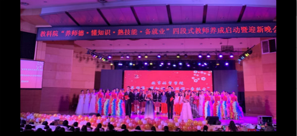 为加强买球官方网站教育科学学院学生师德养成、能力提升并欢迎大一新生、融合师生情谊、展示学院特色,买球官方网站教育科学学院于2019年12月6日在南校音乐厅举办“养师德-懂知识-熟技能-备就业”四段试教师养成启动暨迎新晚会”