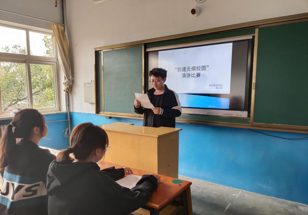 为进一步提高同学们的无烟意识,培养健康文明的新时代优秀学生,推动无烟校园的创建,买球官方网站于10月11日上午在知行楼成功举办“创建无烟校园 ”演讲活动。