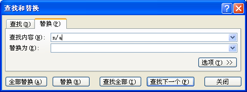 5.然后在击excel中选择菜单“编辑-替换”,在查找内容框中输入“n/a”,替换为框中不输入任何数据,如图6所示,点击“全部替换”按钮。