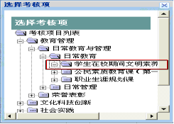 各学院在输入考核成绩时,点击“考核项目”右侧“选择项目”按钮,出现图4,注意选择时一定一直点击到叶子节点为止,即层次中不再有加号“+”。图3中绿色部分为填写说明。