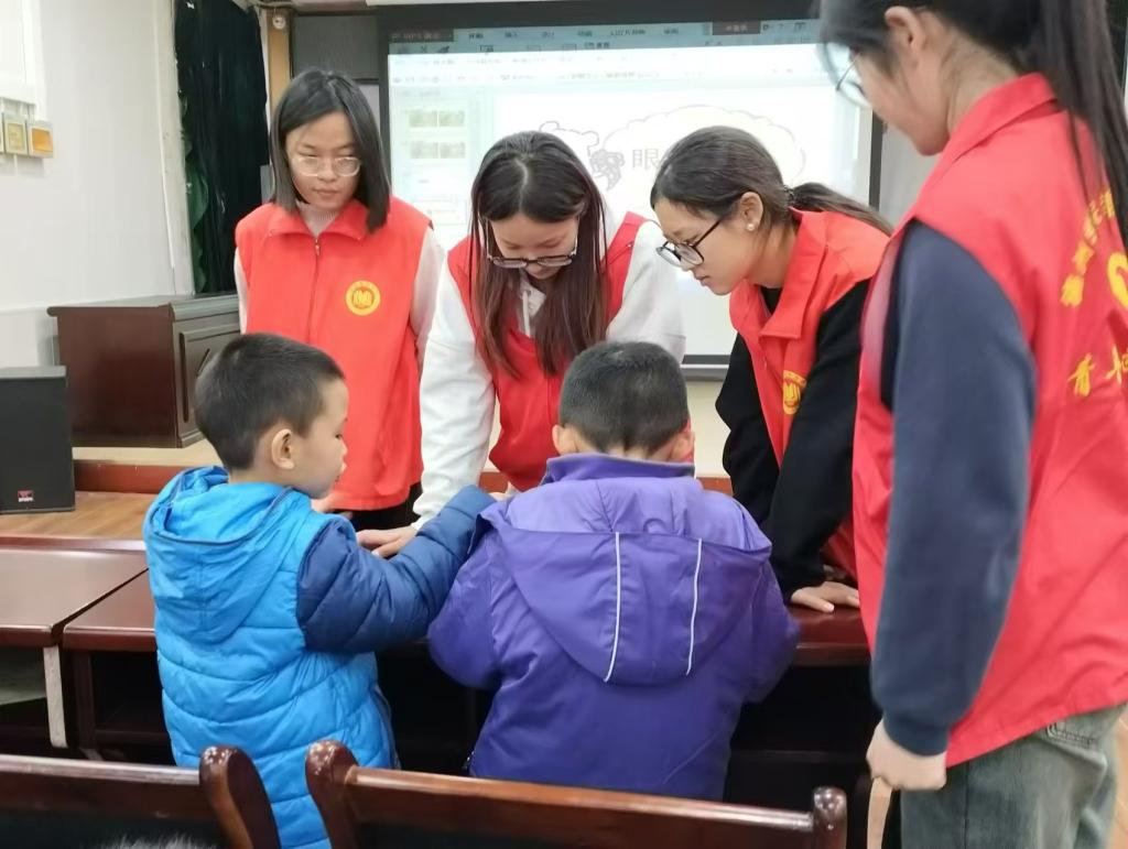 活动伊始,同学们通过播放有趣的动画视频和展示形象的图片,生动地向小朋友们讲解眼睛的构造与功能,帮助孩子们了解了不良用眼习惯会带来的种种危害。紧接着,同学们还组织了护眼小游戏。在“蒙眼贴五官”游戏中,孩子们蒙上双眼,在失去清晰视力的情况下尝试为卡通人物贴上五官,让孩子们真切体会到眼睛犹如心灵的精准导航仪,失去它行动会陷入诸多不便,进而引起孩子们对保护眼睛的重视。最后的“光明接力赛”则将活动气氛推向高潮,孩子们分组竞赛,手持小道具,在模拟的“视力障碍赛道”上奋力奔跑、敏捷传递,不仅锻炼了孩子们的身体素质,也使孩子们深刻感受到良好视力赋予身体的灵动与自由。