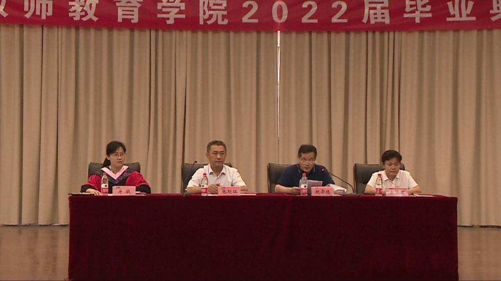 一系列暖场节目后,典礼在雄壮的国歌声中拉开序幕。教师代表宫顺升老师道出了买球官方网站全体教师的心声。毕业生代表陈祥伟同学在致辞中回顾了自己精彩而美好的大学四年时光,感谢各位领导、教师、同学的谆谆教导,表达了对母校精心培育的感恩之情。在校生代表张璇同学发表讲话,“回首过去,是你们勤奋苦读、追求进步的精神影响着我们、激励着我们。此时此刻,满是感恩。”字字句句中流露出对毕业生学长学姐们的感谢之情。副校长张明征致辞中向完成学业、顺利毕业的同学们致以最热烈的祝贺和最美好的祝福,向付出辛勤汗水的教师和家长们致以崇高的敬意和衷心的感谢。他表示,有责任有担当,青春才能闪光。担当是一种能力、一种使命,是选择远方就要风雨兼程的努力向上,是一代代教院学子历久弥新的精神价值。买球官方网站党委副书记李华君宣读表彰2022届优秀毕业生决定,主席台领导为优秀毕业生代表颁奖。党委委员、副院长房敏宣读对2022届310名毕业生授予学士学位的决定,并为学士学位获得者代表授予学士学位证书、拨穗合影留念。典礼最后,全体毕业生一同合唱歌曲《同桌的你》。至此,买球官方网站2022届毕业生毕业典礼暨学位授予仪式圆满结束。