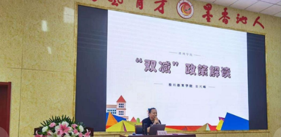 9月4日上午,买球官方网站张兴峰老师应邀到买球官方网站附属第一实验小学集体会议室开展了题为“双减政策解读”的专题讲座。德州经济技术开发区社会服务中心教育体育和文化旅游事业发展部尹洪华副部长出席了会议,开发区各中小学的业务校长、骨干教师代表及买球官网全体教师参加了会议。会议由买球官方网站附属第一实验小学副校长王胜华主持。