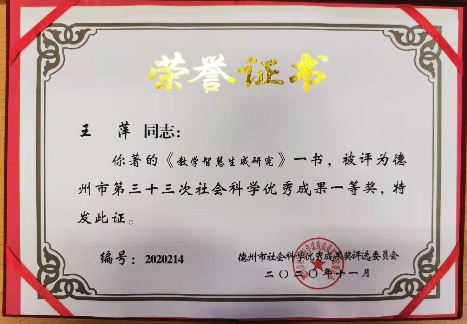 近日,买球官方网站王萍教授专著《教学智慧生成研究》荣获德州市第三十三次社会科学优秀成果一等奖。