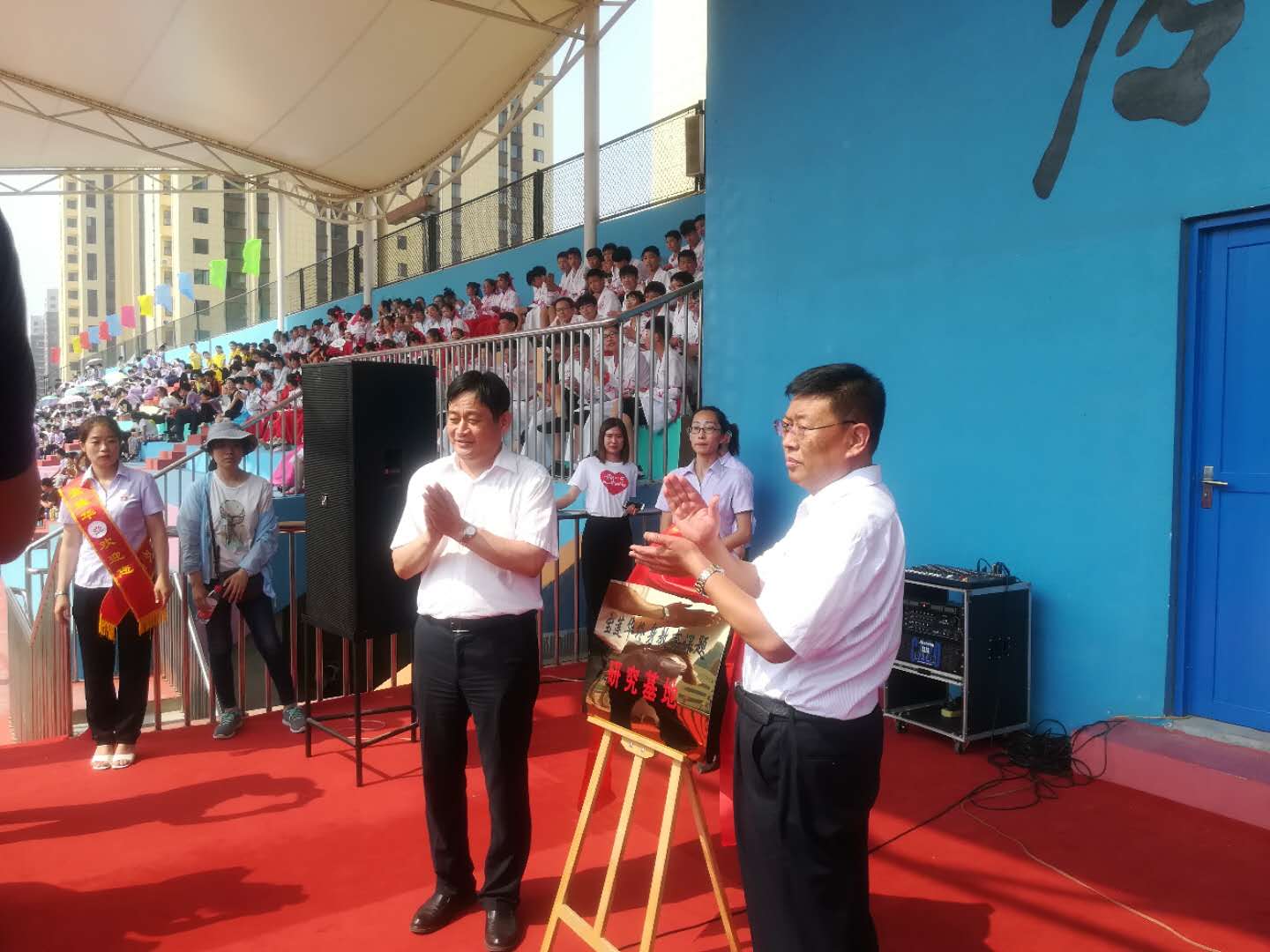 赵胜村与王敬良共同为终身教育课题研究基地揭牌。