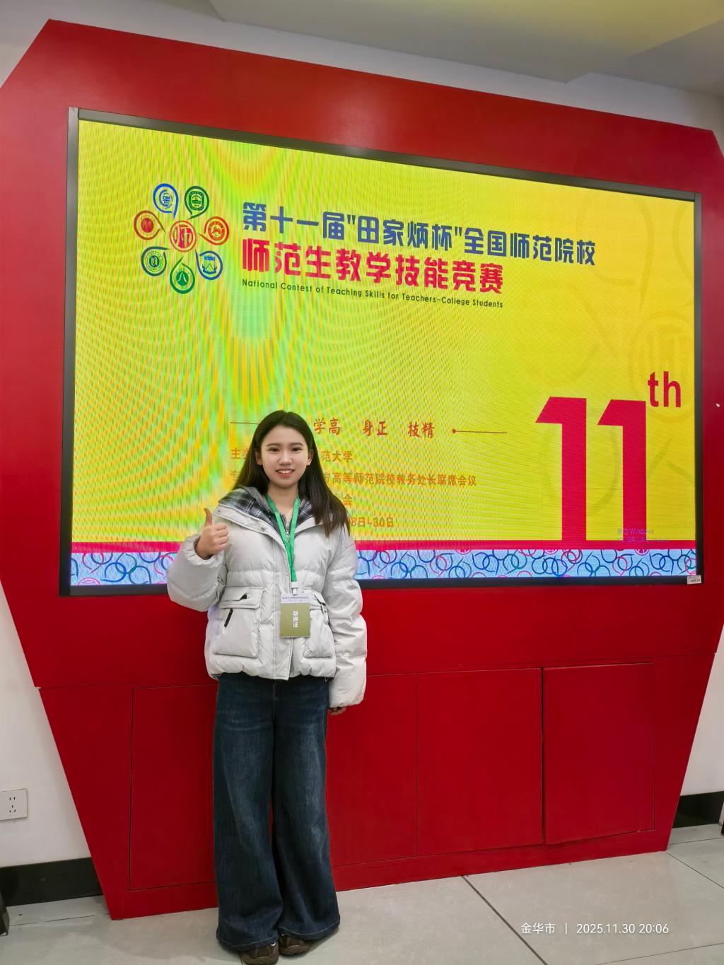 11月28日-30日,由田家炳基金会赞助、全国地方高等师范院校教务处长联席会主办、浙江师范大学承办的第十一届“田家炳杯”全国师范院校师范生教学技能竞赛决赛在浙江省金华市举行。由买球官网唐梦璇、宫顺升老师指导的2025级小学教育(专升本)李雅文同学斩获二等奖。